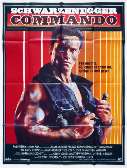 47" x 63" movie poster from COMMANDO (1985), directed by Mark L. Lester with Arnold Schwarzenegger, Rae Dawn Chong, Dan Hedaya, Vernon Wells, James Olson (more on the Imdb)