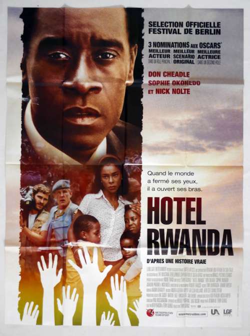 47" x 63" movie poster from HOTEL RWANDA (2004), directed by Terry George with Xolani Mali, Don Cheadle, Desmond Dube, Hakeem Kae-Kazim, Tony Kgoroge (more on the Imdb)