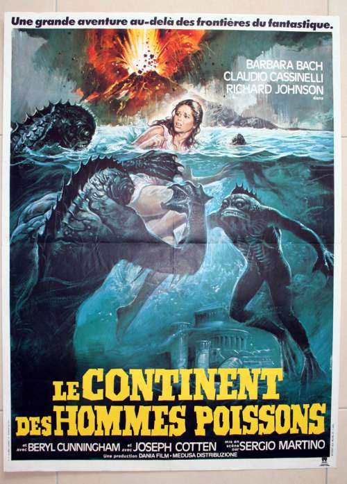 23" x 31" movie poster from ISLAND OF THE FISHMEN (1979), directed by Sergio Martino with Barbara Bach, Claudio Cassinelli, Richard Johnson, Beryl Cunningham, Joseph Cotten, Franco Iavarone (more on the Imdb)