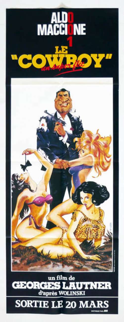 Affiche de cinéma 120 x 160 du film LE COWBOY (PANTALON VISUEL JAMES BOND) (1985), réalisé par Georges Lautner avec Aldo Maccione, Renée Saint-Cyr, Valérie Allain, Corine Lorain, Corinne Touzet (plus sur Imdb)