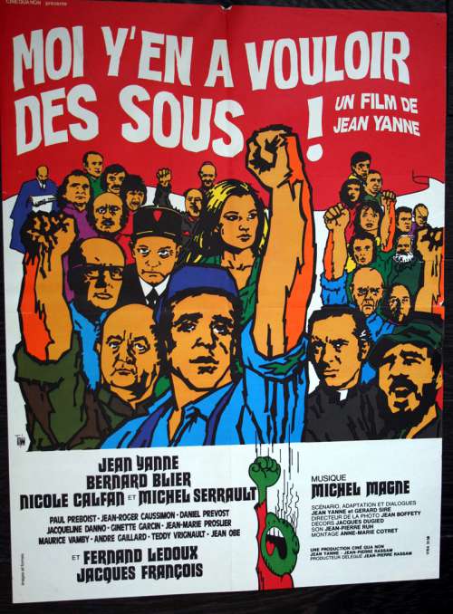Affiches de cinéma 60 x 40 du film MOI Y'EN A VOULOIR DES SOUS (1973), réalisé par Jean Yanne avec Jean Yanne, Bernard Blier, Nicole Calfan, Michel Serrault (plus sur Imdb)