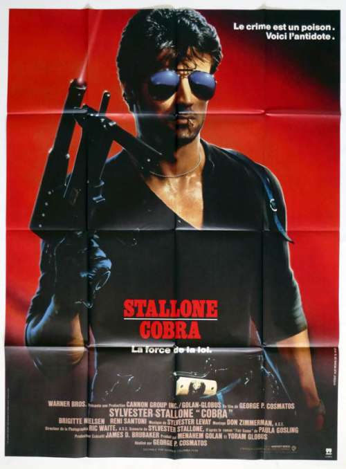 47" x 63" movie poster from COBRA (1986), directed by George P. Cosmatos with Sylvester Stallone, Brigitte Nielsen, Reni Santoni, Andrew Robinson, Brian Thompson (more on the Imdb)