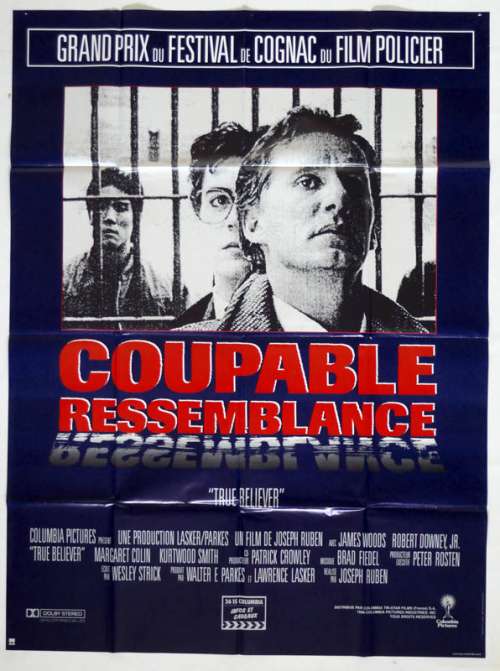 47" x 63" movie poster from TRUE BELIEVER (1989), directed by Joseph Ruben with James Woods, Robert Downey Jr., Margaret Colin, Yuji Okumoto, Kurtwood Smith (more on the Imdb)