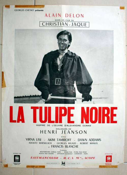 23" x 31" movie poster from THE BLACK TULIP (1964), directed by Christian-Jaque with Alain Delon, Virna Lisi, Adolfo Marsillach, Dawn Addams, Akim Tamiroff, Laura Valenzuela (more on the Imdb)