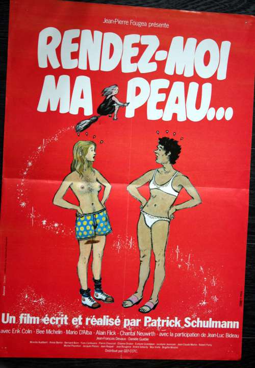 23" x 16" movie poster from GIVE ME BACK MY SKIN (1980), directed by Patrick Schulmann with Erik Colin, Bee Michelin, Chantal Neuwirth, Jean-Luc Bideau, Danièle Gueble, Alain Flick (more on the Imdb)