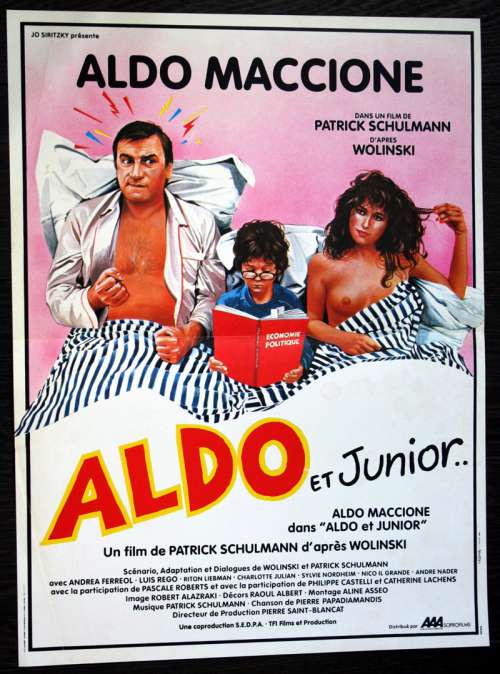 23" x 16" movie poster from ALDO ET JUNIOR (1984), directed by Patrick Schulmann with Aldo Maccione, Andréa Ferréol, Luis Rego (more on the Imdb)
