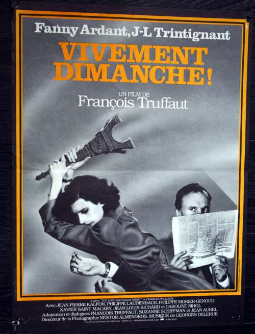 23" x 16" movie poster from FINALLY, SUNDAY! (1983), directed by François Truffaut with Fanny Ardant, Jean-Louis Trintignant, Jean-Pierre Kalfon, Philippe Laudenbach, Philippe Morier-Genoud, Xavier Saint-Macary (more on the Imdb)