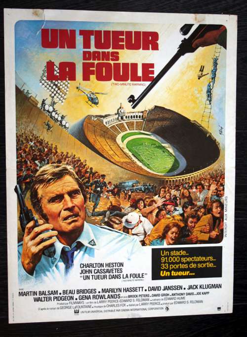 23" x 16" movie poster from TWO-MINUTE WARNING (1976), directed by Larry Peerce with Charlton Heston, John Cassavetes, Martin Balsam, Beau Bridges, Marilyn Hassett, David Janssen (more on the Imdb)