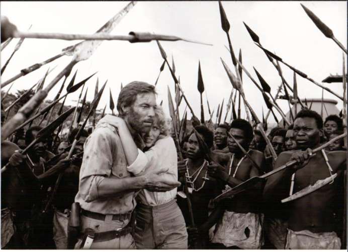 Press still from  KING SOLOMON'S MINES (1985), directed by J. Lee Thompson with Richard Chamberlain, Sharon Stone, Herbert Lom, John Rhys-Davies, Ken Gampu (more on the Imdb)