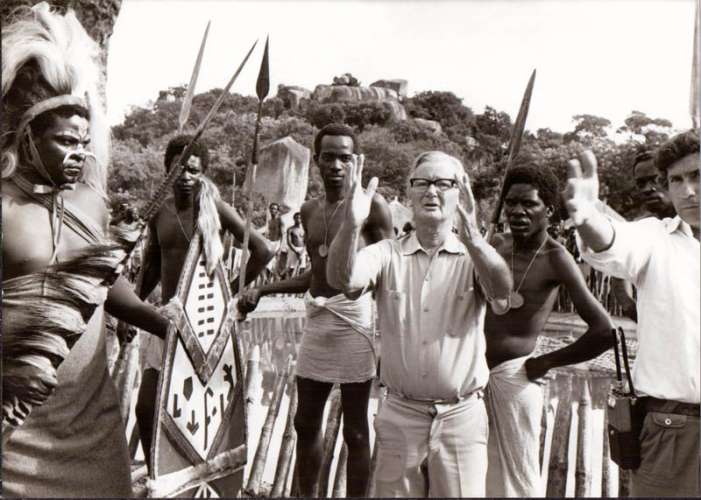 Press still from  KING SOLOMON'S MINES (1985), directed by J. Lee Thompson with Richard Chamberlain, Sharon Stone, Herbert Lom, John Rhys-Davies, Ken Gampu (more on the Imdb)