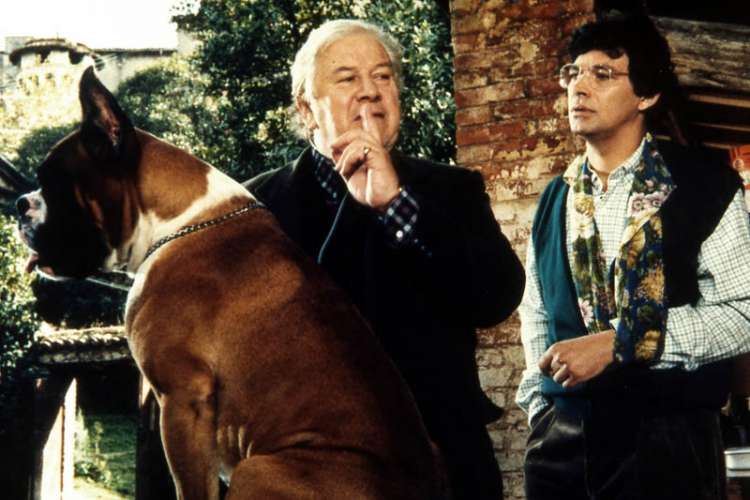 Slide from THERE WAS A CASTLE WITH FORTY DOGS (1990), directed by Duccio Tessari with Peter Ustinov, Delphine Forest, Roberto Alpi, Mercedes Alonso, Salvatore Cascio (more on the Imdb)