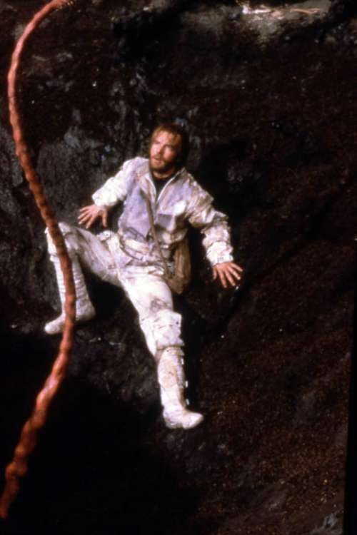 Slide from ENEMY MINE (1985), directed by Wolfgang Petersen with Dennis Quaid, Louis Gossett Jr., Brion James, Richard Marcus, Carolyn McCormick (more on the Imdb)
